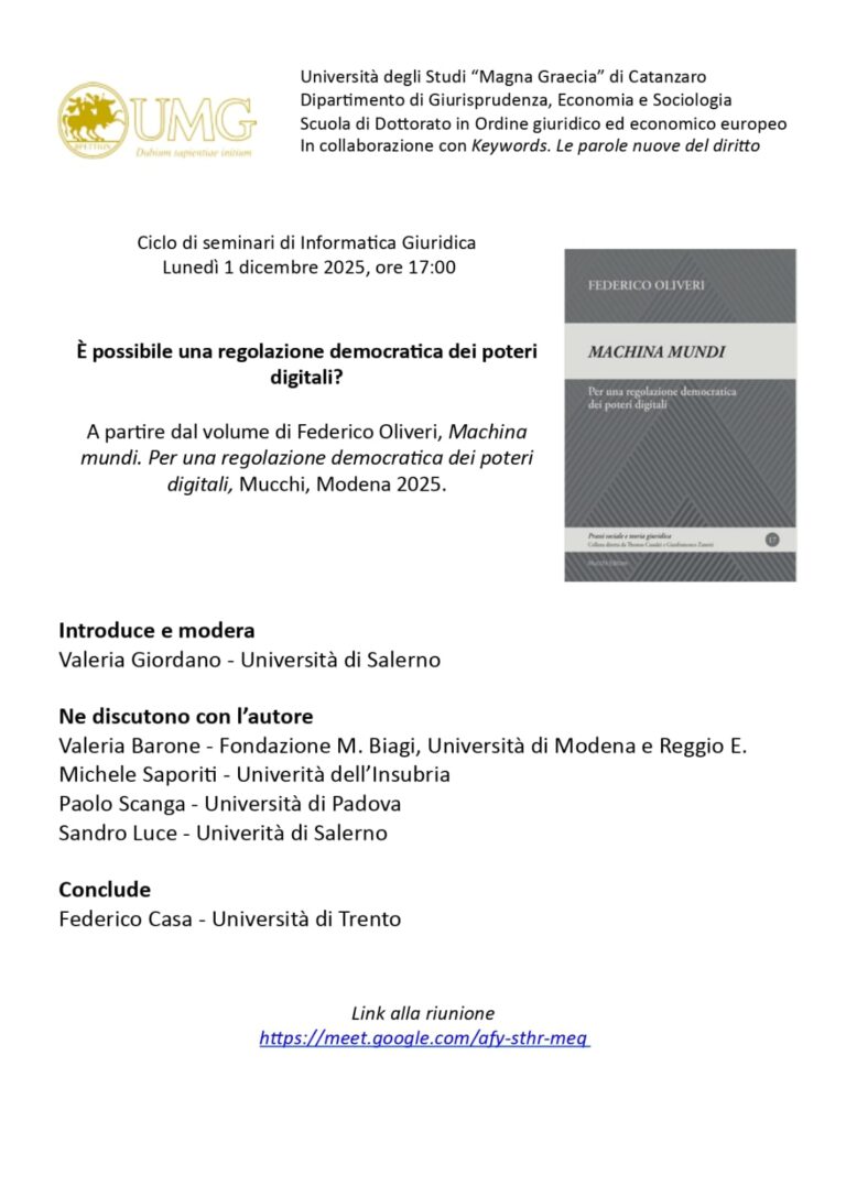 Dipartimento di Giurisprudenza, Economia e Sociologia – Ciclo di seminari di Informatica Giuridica